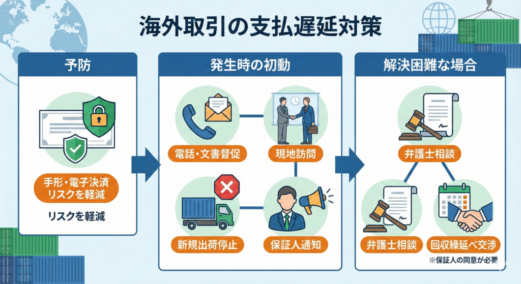 海外取引における債権管理は、事前の契約による「予防」と、遅延発生時の「迅速な初動」が全てです。